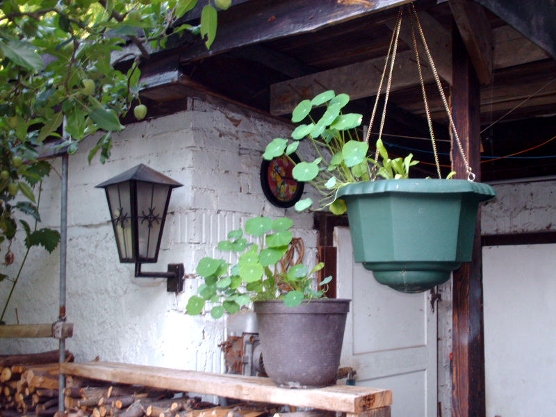 Kapuzinerkresse, die Blüten wurden nach dem Namen der Kopfbedeckung der Kapuzinermönche benannt. Sie kann als Kletterpflanze, Bodendecker aber auch als Kübel- Topf oder Ampelpflanze genutzt werden. Die Blüten können zur Dekoration von Gerichten benutzt werden, auch die Blätter sind essbar. Bild 1 zeigt junge Kapuzinerpflanzen als Ampelpflanzen, sie werden dekorativ das Holzlager überdecken.